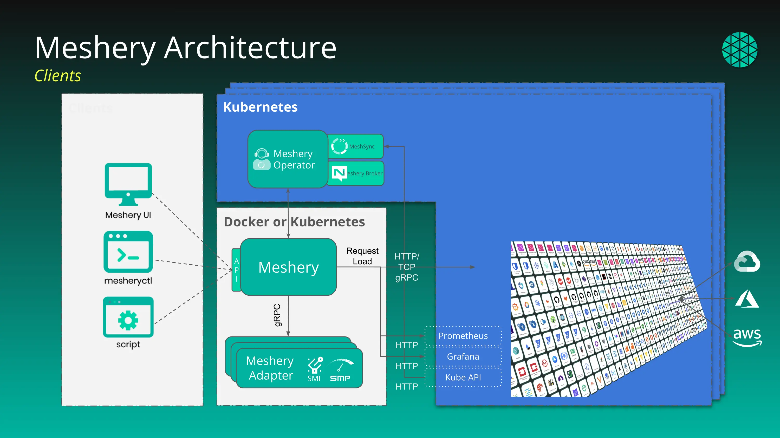 - Broker - Meshery broker component facilitates data streaming between kubernetes cluster components and outside world.
