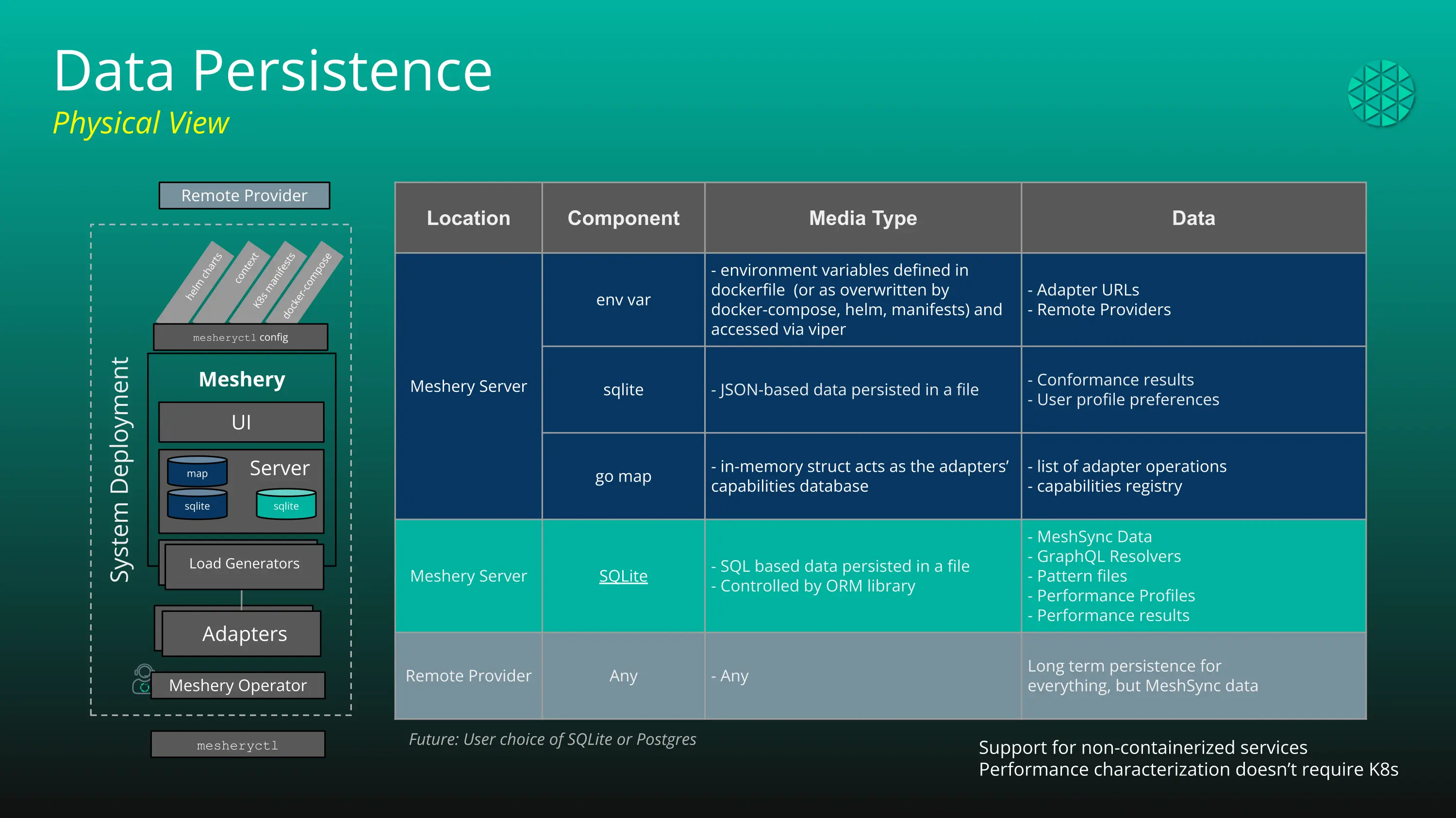 Meshery Databases function as repositories for MeshSync, user preferences and system settings. Both databases are considered ephemeral and should be treated as caches. Data retention is tethered to the lifetime of their Meshery Server instance. Remote Providers may offer long-term data persistence. Meshery’s APIs offer mechanisms for clients, like mesheryctl and Meshery UI to retrieve data.