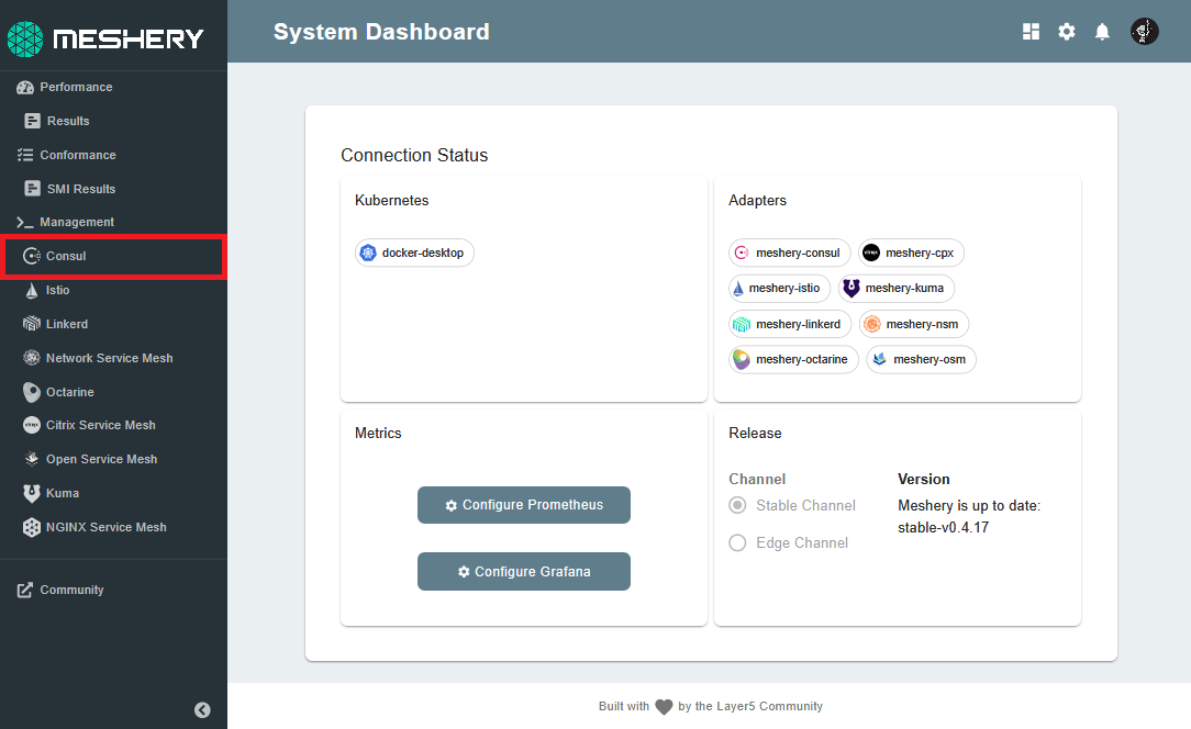 In Meshery's UI, choose the Meshery Adapter for Consul.