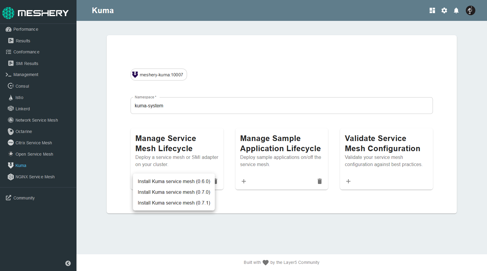 The Meshery Adapter for Kuma can install v1.2.2 of Kuma. A number of sample applications can be installed using the Meshery Adapter for Kuma.
