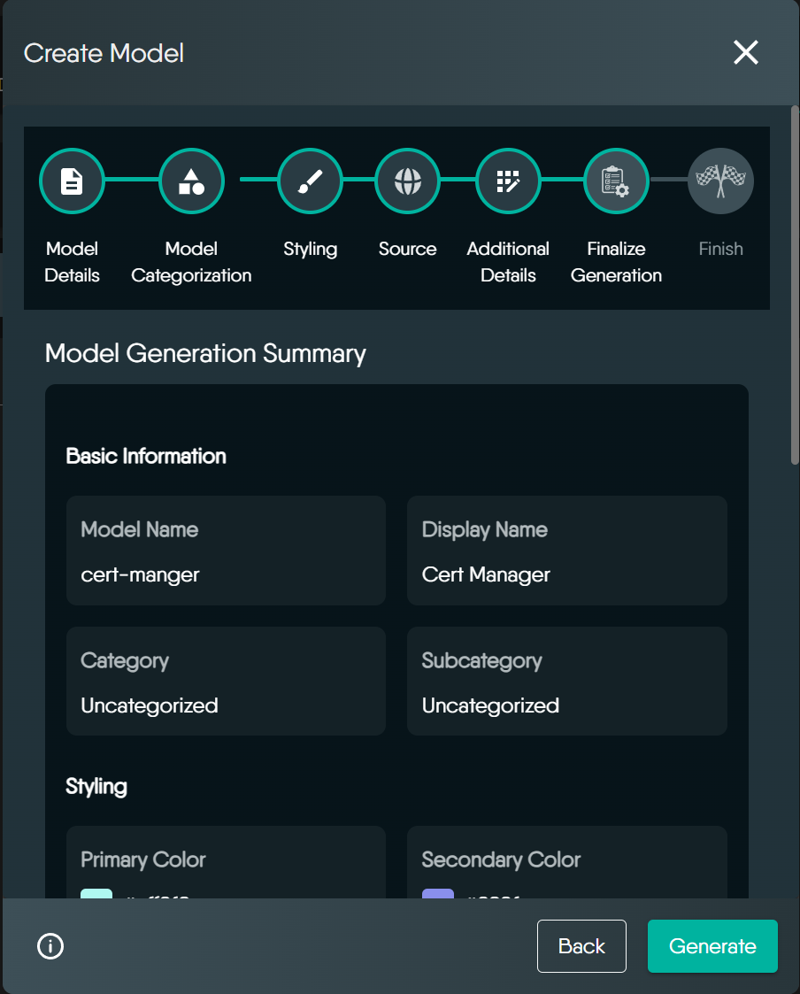 Review your model details. If everything looks good, click "Generate" to create your model.