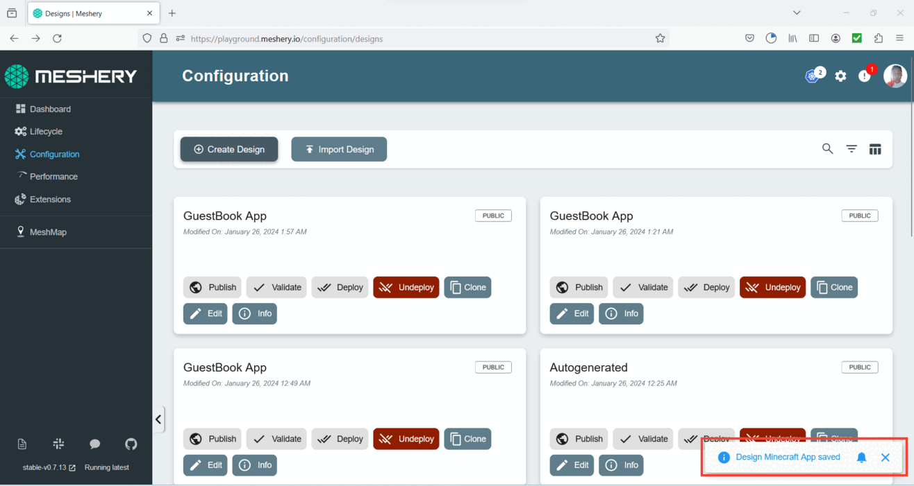 - Upon successful import, a pop-up message will confirm the completion, and it will also indicate that your design has been automatically saved in Meshery.