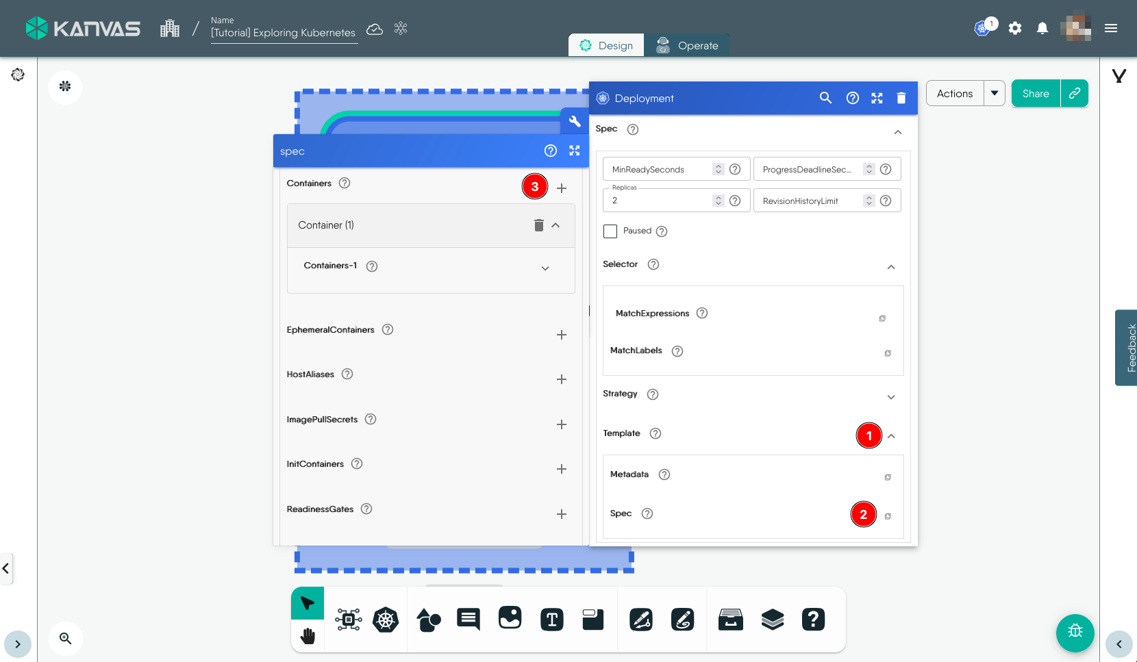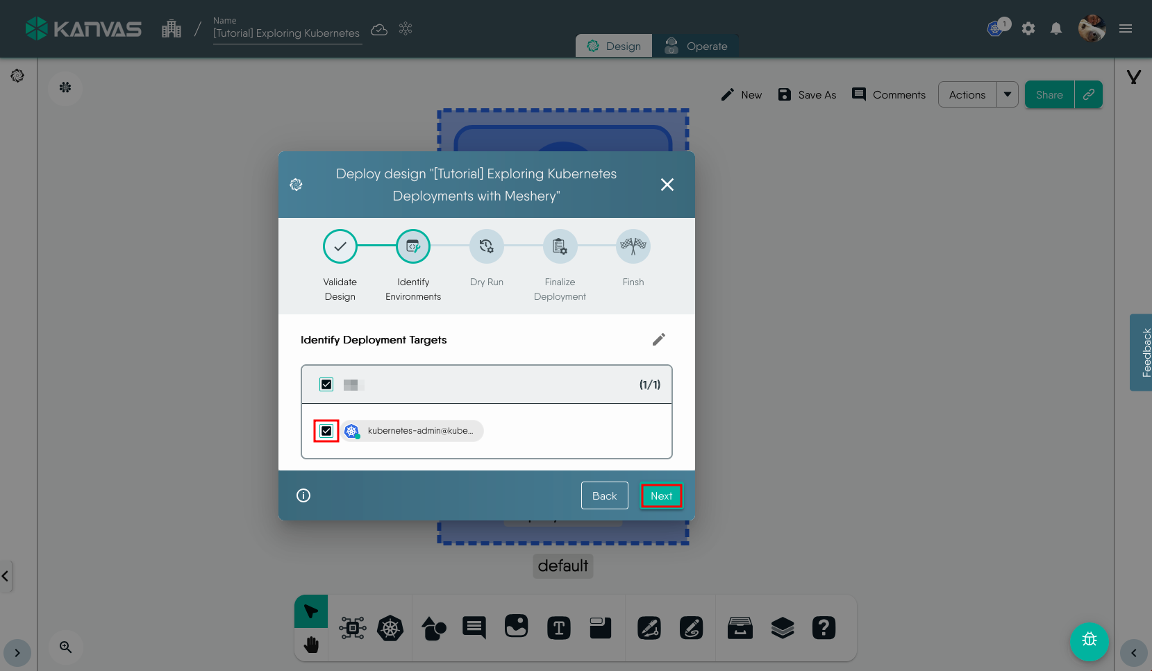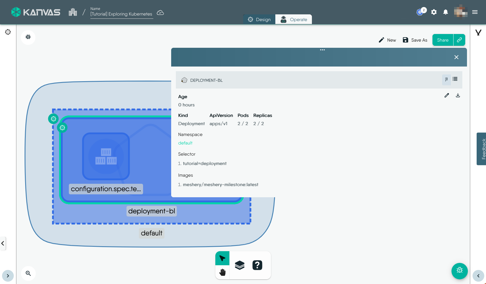 To view and perform operations on the resources deployed, i.e. the Deployment in this exmaple, we will use the Operate functionality of Kanvas. You can open the design in Operate mode during the Deploy workflow or later by click the Operate tab. It will load the deployed resources in Operate view similar to the screenshot below.