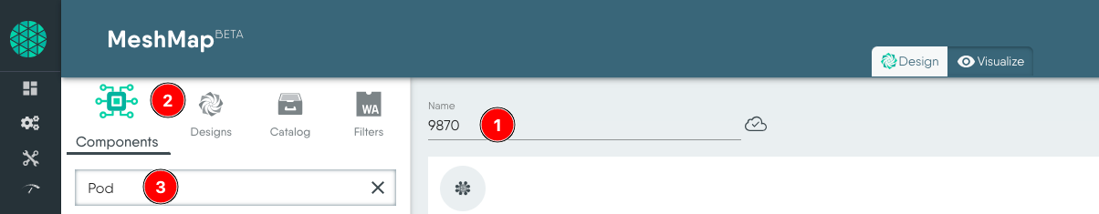 - Scroll down, select and drag the Pod component from the search results to the design canvas on the right.