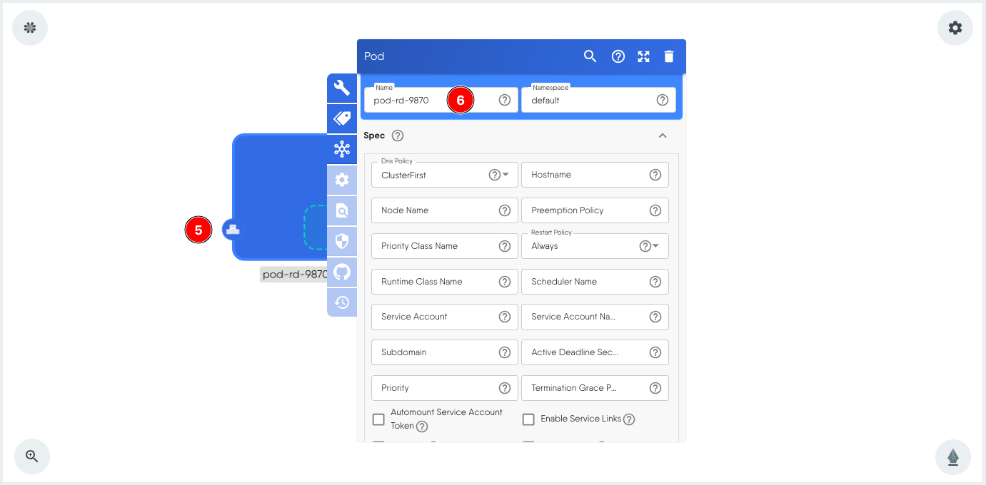 - You should now have a pod in the design canvas for further configuration. It has a default name assigned to it. Click the pod component to load the configuration modal.