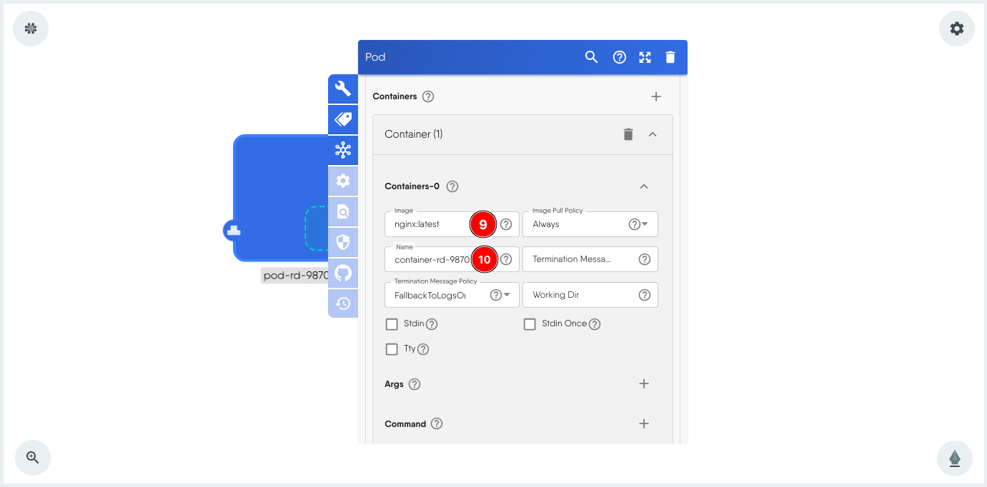 The pod at this stage does not have a container, so we will add one. This is similar to defining the containers in the spec: section of a YAML file. For this hands-on we will make some basic and necessary configurations only.