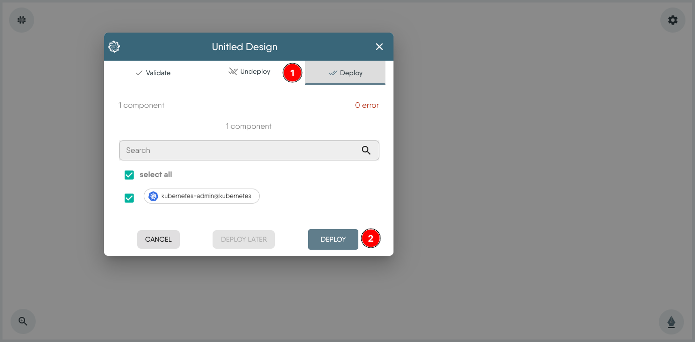 Ensure there are no errors before deploying. To deploy, click the Deploy (1) tab in the pop-up modal and then click Deploy (2) again.
