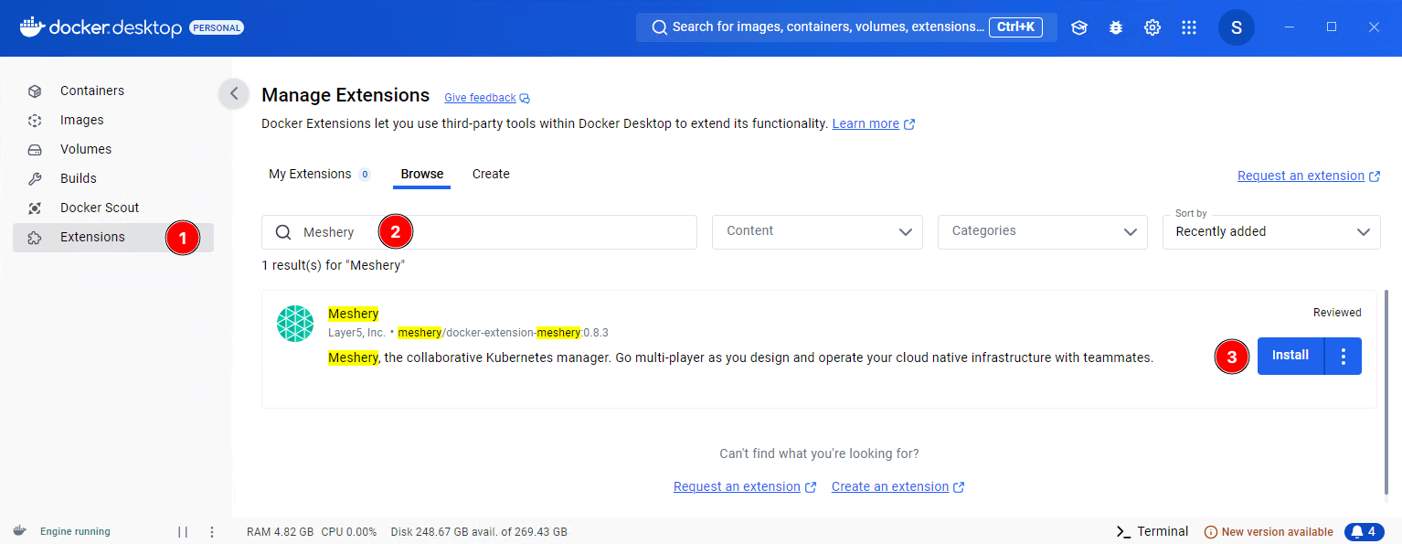 Navigate to the Extensions marketplace of Docker Desktop. Search for Meshery and click the Install button to install the extension.
